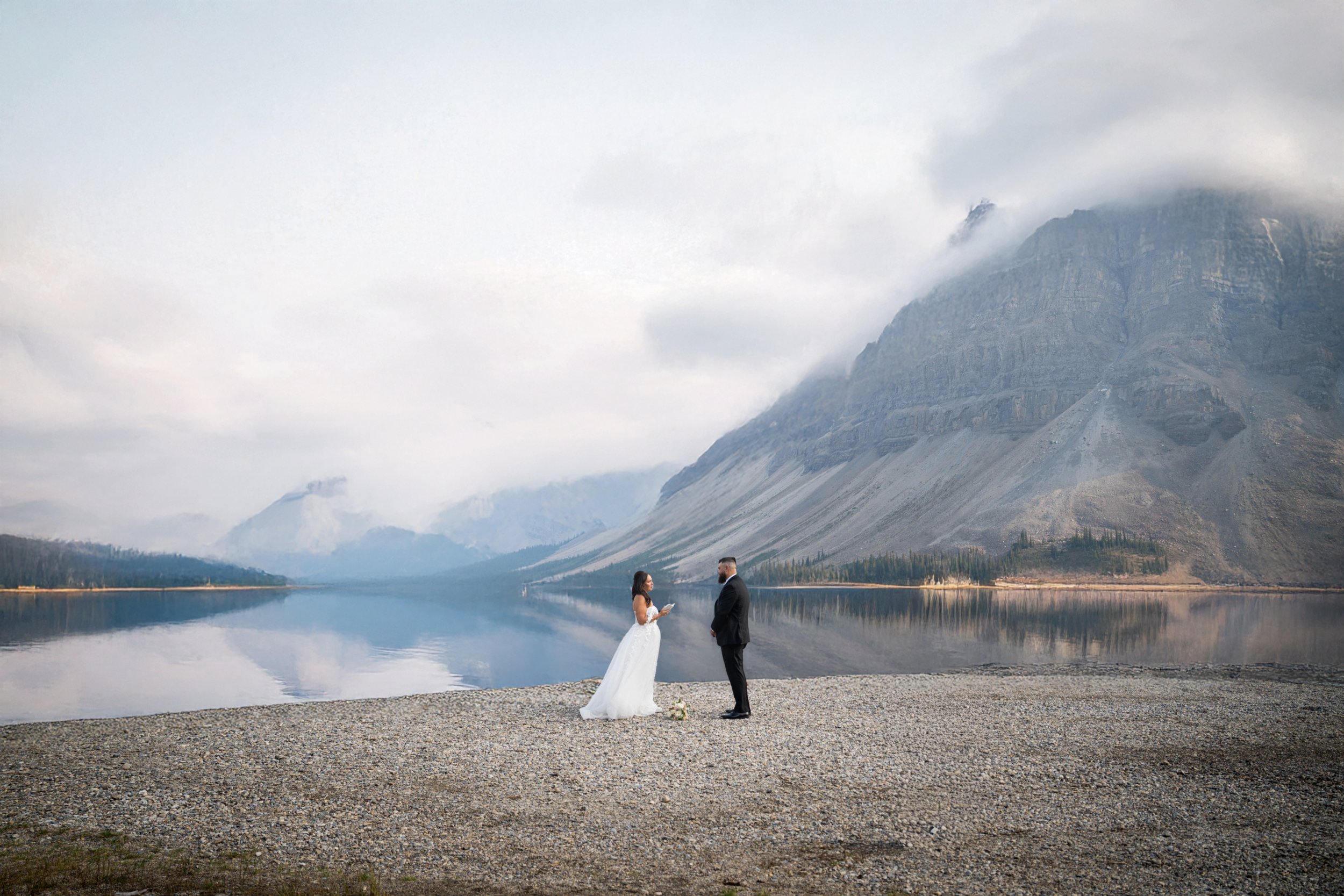 Their ceremony at Bow Lake in Banff National Park was simple, scenic, and deeply moving. Elopements often feel most powerful when they are allowed to stay close to what matters, and this ceremony was a perfect reflection of that. Surrounded by alpine views and the calm shoreline of Bow Lake, the focus stayed exactly where it should — on the commitment they were making to one another.